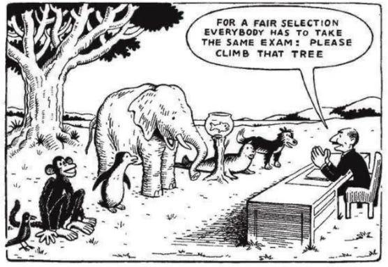 M’encanta recordar aquella imatge en què un mestre fa fer el mateix examen a tots els animals: per ser “justos”, tots han de pujar a un arbre. El mico ho petarà, però el peix...?